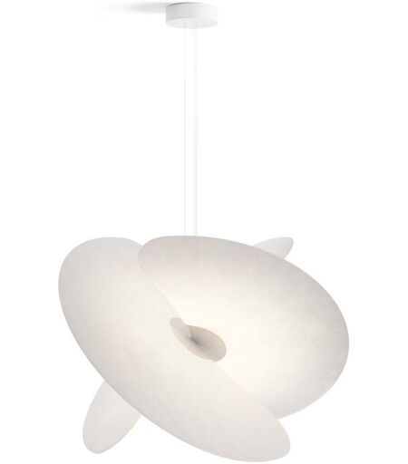 Die Luceplan Levante Pendelleuchte mit starker optischer Wirkung wird der neue Star in Ihren Wohnräumen oder Geschäftsbereichen sein. Entworfen von Marco Spatti erzielt er mit der Levante Pendelleuchte gekonnt ein einheitliches Design voller Stilsicherheit und Anmut. Levante (dessen Name auf Leichtigkeit und Wind hindeutet, aber auch einen Bezug zur orientalischen Ästhetik aufweist) entsteht aus der Kreuzung von drei großen gerundeten Platten mit reispapierähnlichem Aussehen, die das Licht gleichmäßig und diffus über den gesamten Raum verteilen. Diese dünnen gerundeten Platten sind magnetisch an der weißen Aluminiumstruktur befestigt, in der die Lichtquelle untergebracht ist und bilden einen visuell reizvollen und vielschichtigen Körper. Das eindrucksvolle Gesamtbild ist ätherisch, wie ein im freien Raum schwebender Organismus. Dieses ungewöhnliche Spiel von Transparenz und optischer Lei... ...