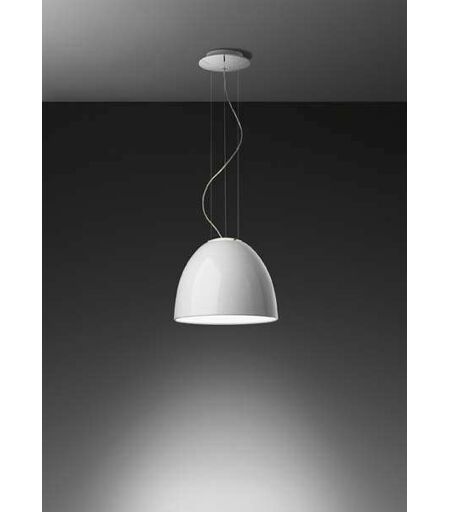 Die Nur Mini Gloss Pendelleuchte von Artemide besticht durch ihr puristisches Design. Ernesto Gismondi entwarf im Jahr 2008 die Leuchte für den italienischen Hersteller Artemide. Die Leuchte ist ein Teil der Nur-Kollektion. Die Leuchte sorgt für direktes und indirektes Licht. Der Leuchtkörper der Nur Mini Gloss von Artemide besteht aus Aluminium. Zwei Versionen sind erhältlich. Zum einen gibt es die Pendelleuchte in einer glänzend schwarzen, zum anderen in weiß glänzenden Ausführung. Aus sandgestrahltem Glas besteht die obere Abdeckung. Die kleine Artemide Nur Mini Gloss besitzt ein Halogenleuchtmittel. Dank einer Länge von max. 2m ist die Pendelleuchte auch für hohe Räume geeignet und macht auf Grund ihrer Maße über einem Esstisch eine gute Figur. Die Nur Mini Gloss Pendelleuchte von Artemide besitzt eine klassische Form und sorgt für eine angenehme Lichtatmosphäre. Je nach Belieben kan... ...