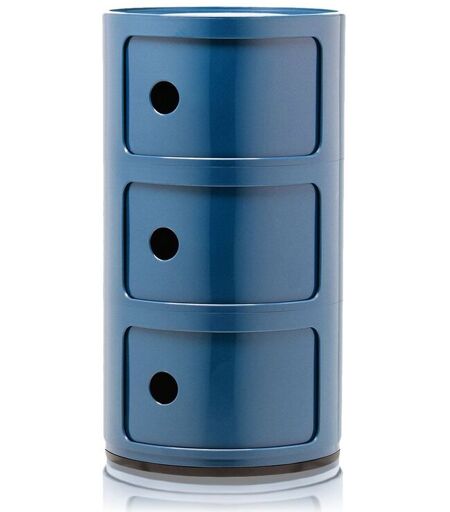 Der Kartell Componibili 3 Elemente Container ist ein schlichter Behälter mit Schiebetüren nach einem Entwurf von Anna Castelli Ferrieri. Das zeitlose Design entstand bereits im Jahr 1969 und ziert seitdem unzählige Flure, Küchen, Wohn- und Arbeitsräume. Als fester Bestandteil der modernen Designgeschichte ist die Kartell Componibili- Kollektion auch Teil der ständigen Ausstellung des Museums of Modern Art und des Centre George Pompidou. Der Kartell Componibili 3 Elemente Container wird aus durchgefärbtem ABS-Kunststoff gefertigt und ist dadurch sowohl stabil als auch pflegeleicht. Die drei Fächer verfügen über eine Schiebetür, die Stauraum für Utensielien und Kleinkram von der Büroklammer bis zum Holzspielzeug. Die verschiedenen Farben des Kartell Componibili 3 Elemente Container setzen gekonnte Akzente oder können passend zum bestehenden Interieur gewählt werden. Im Jahr 2024 w... ...