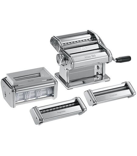 Eine Maschine, sechs Nudelformate! Das Set Multipast umfasst eine Nudelmaschine Atlas 150 und drei Sonderzubehörteile für insgesamt 6 verschiedene Nudelformate. Das Set ist ganz aus hochwertigem Chromstahl. Die Walzen sind aus eloxierter Aluminiumlegierung, dem Kennzeichen der Marcato-Produkte, während die Kämme und Schaber aus Polymerharz sind, damit keine schädlichen Stäube auf den Nudeln zurückbleiben und ein gesundes und 100 % natürliches Produkt garantiert wird Mit Aufsätzen für Raviolini, Spaghetti und Reginette Für Lasagne, Fettuccine und Tagliolini Material: Edelstahl Marcato ...