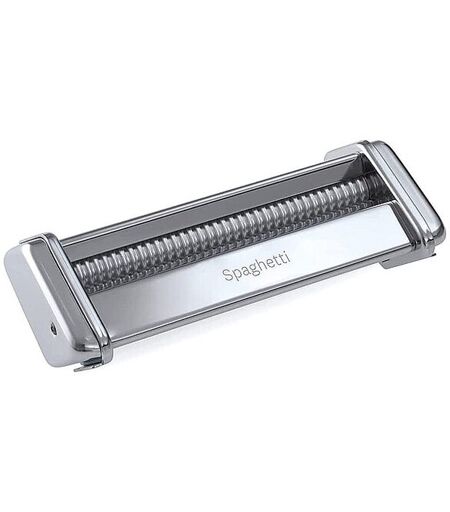 Spaghetti sind ein rundes Nudelformat mit einem Durchmesser von 2 mm. Die empfohlene Stärke des Teigblatts ist die Reglerposition Nr. 4 auf der Nudelmaschine. Material: Edelstahl Artikelmaße L x B x H: 8 x 18 x 4 cm Kompatibilität: Atlas 150 ...