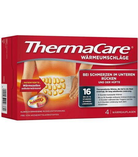 Anwendungsgebiet von ThermaCare bei Schmerzen im unteren Rücken und der HüfteThermaCare bei Schmerzen im unteren Rücken und der Hüfte eignen sich besonders gut zur Behandlung von Verspannungen im unteren Rücken. Die hautfreundlichen Umschläge mit 16 patentierten Wärmezellen sind dank des elastischen Materials und Klettverschlusses stufenlos größenverstellbar. Wirksame und gezielte Linderung von Muskel- und/oder Gelenksschmerzen im Zusammenhang mit: Überanstrengung Zerrungen und Verstauchungen Arthrose Muskelverspannungen Geeignet bei akuten, chronischen und gelegentlichen Schmerzen. Dieses Produkt ist für Patient:innen ab 12 Jahren bestimmt, die das Produkt selbstständig anwenden können. Siehe besondere Warnhinweise und Vorsichtsmaßnahmen für die Anwendung. Wirkungsweise von ThermaCare bei Schmerzen im unteren Rücken und der HüfteThermaCare bei Schmerzen im unteren Rücken und der Hüfte enthält kleine, mit Eisenpulver, Aktivkohle, Salz und Wasser gefüllte Wärmezellen. In Verbindung mit Luftsauerstoff wird in diesen Zellen die wohltuende Wärme produziert. Diese verhindert die Weiterleitung der Schmerzreize zum Gehirn. Das Ausspülen von Entzündungsstoffen wird durch die Förderung der Blutzirkulation beschleunigt.GegenanzeigenIn folgenden Fällen sollten Sie das Produkt nicht anwenden: falls Sie 55 Jahre oder älter sind, sollten Sie ThermaCare nicht direkt auf die Haut auftragen, um einer eventuellen Verbrennungsgefahr entgegenzuwirken nicht im Schlaf in Kombination mit anderen Arten von Wärmepflastern oder medizinischen Einreibemitteln auf verletzter, geschädigter oder erkrankter Haut bei Prellungen oder Schwellungen auf Körperstellen ohne Wärmeempfindungen falls Sie das Produkt nicht selbst entfernen können DosierungGebrauchsanweisung von ThermaCare bei Schmerzen im unteren Rücken und der Hüfte: Reißen Sie den Beutel u ...