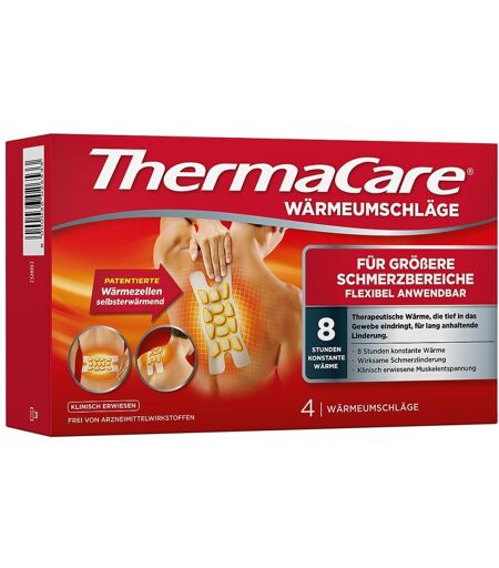 Anwendungsgebiet von ThermaCare für größere SchmerzbereicheThermaCare für größere Schmerzbereiche eignen sich besonders gut zur Behandlung von großen Schmerzbereichen an Schulter und oberem Rücken. Die hautfreundlichen Auflagen mit 13 patentierten Wärmezellen sind flexibel einsetzbar und werden mit vier Klebepunkten auf der Haut angebracht. Wirksame und gezielte Linderung von Muskel- und/oder Gelenksschmerzen im Zusammenhang mit: Überanstrengung Zerrungen und Verstauchungen Arthrose Muskelverspannungen Geeignet bei akuten, chronischen und gelegentlichen Schmerzen. Dieses Produkt ist für Patient:innen ab 12 Jahren bestimmt, die das Produkt selbstständig anwenden können. Siehe besondere Warnhinweise und Vorsichtsmaßnahmen für die Anwendung. Wirkungsweise von ThermaCare für größere SchmerzbereicheDie ThermaCare Wärmeentwicklung basiert auf einem effektiven Naturprinzip - Wärme durch Oxidation. Somit erwärmen sich die Umschläge und Auflagen bei Luftkontakt von selbst und sind frei von jeglichen Arzneiwirkstoffen. So setzt ThermaCare auf natürliche Weise ein Zeichen gegen Muskel-, Regel- und Gelenkschmerzen und unterstützt Sie bei einem schmerzfreien Leben!Wirkstoffe / Inhaltsstoffe / ZutatenInhaltsstoffe von ThermaCare für größere Schmerzbereiche: Eine Wärmezelle enthält: Eisenpulver Salz Aktivkohle Wasser GegenanzeigenBitte wenden Sie das Produkt nicht an: zusammen mit medizinischen Einreibemitteln, Pflastern oder anderen Arten von Wärme auf erkrankter, verletzter oder geschädigter Haut auf Prellungen oder Schwellungen auf Körperstellen ohne Wärmeempfindung bei Personen, die das Produkt nicht selbst entfernen können Bei Diabetes, Durchblutungsstörungen, Herzerkrankungen, rheumatischer Arthritis oder während der Schwangerschaft konsultieren Sie vor der Anwendung einen Arzt. Bei bekannter Überempfindlichk ...