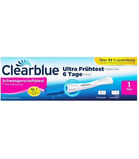 Anwendungsgebiet von Clearblue Schwangerschaftstest frühe ErkennungClearblue Schwangerschaftstest frühe Erkennung liefert Ergebnisse 6 Tage vor dem Ausbleiben der Periode („Ausbleiben der Periode“ bezieht sich auf den Tag nach dem Fälligkeitstag Ihrer Periode). Ab dem Fälligkeitstag Ihrer Periode über 99 % zuverlässig. Bei 79 % der Proben, die in einer Laboruntersuchung getestet wurden, konnte die Schwangerschaft bis zu 6 Tage vor dem Ausbleiben der Periode erkannt werden (dies entspricht 5 Tage vor dem Fälligkeitstag der Periode).Wirkstoffe / Inhaltsstoffe / ZutatenClearblue Schwangerschaftstest frühe Erkennung enthält:HCG-TestzoneGegenanzeigenLesen Sie vor der Durchführung eines Tests grundsätzlich die Anweisungen der Hersteller der Medikamente durch, die Sie gerade einnehmen. Medikamente, die hCG enthalten, und bestimmte seltene Erkrankungen können zu falschen Positiv-Ergebnissen führen. Eileiterschwangerschaften oder eine kürzliche Schwangerschaft, auch wenn diese nicht ausgetragen wurde, können zu irreführenden Ergebnissen führen. Wenn Sie kurz vor oder in den Wechseljahren sind, können Sie ein falsches Ergebnis „Schwanger“ erhalten, obwohl Sie nicht schwanger sind. Hormontherapien mit Clomiphencitrat, gängige Schmerzmittel, Alkohol, Antibiotika oder die Antibabypille sollten KEINE Auswirkungen auf den Test haben. Wenn Sie unerwartete Ergebnisse erhalten, sollten Sie Ihren Arzt kontaktieren.DosierungAnwendungsempfehlung von Clearblue Schwangerschaftstest frühe Erkennung: Dieser Test ist für die Verwendung zu Hause bestimmt. Für Kinder unzugänglich aufbewahren. Lesen Sie die beigefügte Gebrauchsanweisung vor Gebrauch des Produkts sorgfältig durch.HinweiseFür den Selbsttest zu Hause. Ausschließlich zur Verwendung in der In-vitro-Diagnostik. Nicht zur inneren Anwendung. Nicht wiederverwenden.Für Kinder unzugänglich aufbewahren.Bei 2 °C bis 30 °C aufbewahren.Bei Aufbewahrung im K� ...
