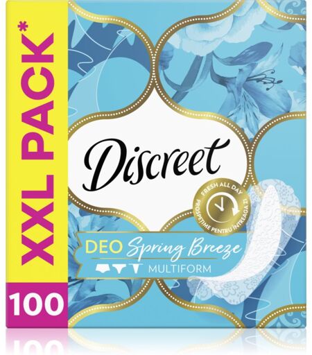 Discreet Multiform Spring Breeze, 100 St., Slipeinlagen für Damen, Eigenschaften: mit leichtem Parfüm bleibt auch bei der Bewegung sicher an Ort und Stelle ökonomisch günstige Verpackung hohe Luftdurchlässigkeit ...