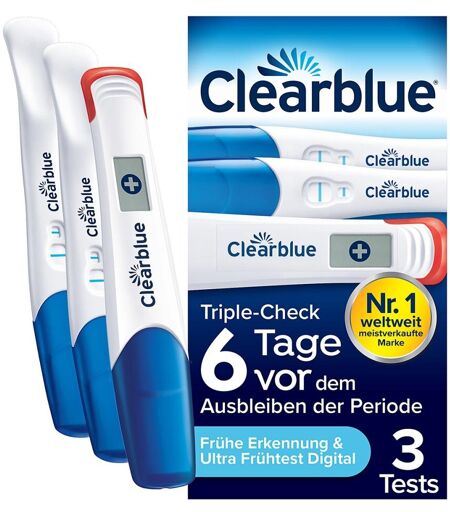 Anwendungsgebiet von Clearblue Schwangerschaftstest Triplecheck Ultra-frühClearblue Schwangerschaftstest Triplecheck Ultra-früh enthält 3 Schwangerschaftstests mit einer Testempfindlichkeit von 10 mIU/ml für zusätzliche Sicherheit in der Frühschwangerschaft! Mit dieser Packung können Sie bis zu 6 Tage vor dem Ausbleiben der Periode (5 Tage vor Fälligkeit der Periode) DREI Tests durchführen1). Sie enthält einen Clearblue Schwangerschaftstest Ultra Frühtest Digital und zwei Clearblue Schwangerschaftstests Ultra Frühtest. Mit keinem anderen Test können Sie früher testen! Dieses Schwangerschaftstestkit zur Heimanwendung ist ab dem Fälligkeitstag Ihrer Periode zu über 99 % zuverlässig und bietet die Präzision, die Sie von Clearblue erwarten. Der Clearblue Schwangerschaftstest Ultra Frühtest Digital kombiniert eine ultrasensitive Früherkennung des Schwangerschaftshormons hCG mit eindeutigen digitalen Ergebnissen. Das Testen wird durch eine besonders breite Testspitze und durch das einzigartige Stopp-Licht vereinfacht, das blinkt, wenn ausreichend Urin von der Testspitze aufgenommen wurde. Unsere Floodguard(TM)-Technologie erleichtert zusätzlich das korrekte Testen. Nach der Probenahme wird der Smart Countdown(TM) auf dem Display angezeigt, um zu bestätigen, dass der Test auswertet, und um die Zeit bis zu Ihrem eindeutigen digitalen Ergebnis anzuzeigen, das innerhalb von 1–5 Minuten erscheint. 1) Clearblue Ultra Frühtest: 79 % der Ergebnisse „Schwanger“ können 6 Tage vor dem Ausbleiben der Periode erkannt werden (dies entspricht 5 Tage vor Fälligkeit der Periode). Clearblue Schwangerschaftstest Ultra Frühtest Digital: 78% der Ergebnisse „Schwanger“ können 6 Tage vor dem Ausbleiben der Periode erkannt werden (dies entspricht 5 Tage vor Fälligkeit der Periode). GegenanzeigenSchwangerschaftstest Frühe Erkennung:Lesen Sie vor der Durchführung eines Tests grundsätzlich die Anweisungen der Herstelle ...