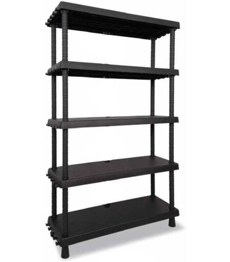 Fachbodenregale aus Kunststoff, für Büro, Haushalt, Keller und Garage die Regale sind gegen Schimmel, Korrosion und Chemikalien beständig sehr schnelle Montage, die Fachböden werden auf Kunststoffrohre geschoben, wodurch eine ausreichend stabile Konstruktion geschaffen wird die Fachböden der Regale sind mit Häkchen ausgestattet, mit denen die Regale reihenweise verbunden werden können die Fachböden sind höhenverstellbar Eigenschaften: Tragfähigkeit je Boden (kg): 45, Anzahl Regalböden: 5, Regalbodenmaterial: Kunststoff, Höhe (mm): 1645, Breite (mm): 920, Tiefe (mm): 450, Farbe: schwarz, Ausführung: Grundregal, Montageart: einschiebbar ...