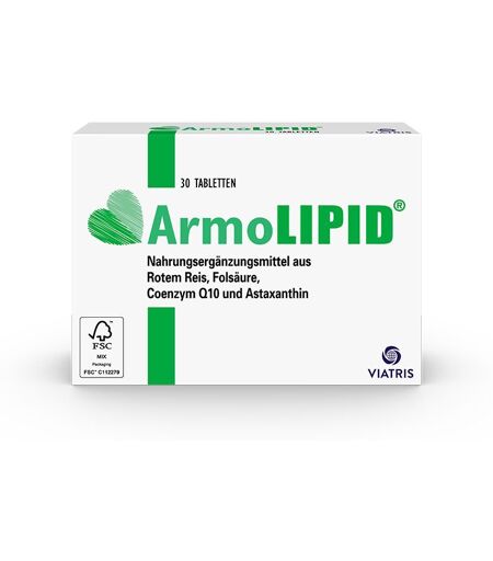 Nahrungsergänzungsmittel sind kein Ersatz für eine abwechslungsreiche und ausgewogene Ernährung und eine gesunde Lebensweise. ArmoLIPID Cholesterin natürlich im Griff Freie Bahn für die Gefäße Unterstützt die Lipidsenkung dank Roter-Reis-Komplex Nur eine Tablette täglich Für ein cholesterinbewusstes Leben Ein erhöhter Cholesterinspiegel zählt zu den größten Risikofaktoren für Herz-Kreislauferkrankungen. Diese erhöhten Blutfettwerte sind, laut WHO, in Europa mit fast 50% die häufigste Ursache für einen vorzeitigen Tod*. Eine erhöhte Cholesterinmenge im Blut kann dazu führen, dass sich Cholesterin in den Gefäßwänden ablagert, man spricht von Atherosklerose. Neben den Ablagerungen kann es zu weiteren Prozessen kommen wie zum Beispiel chronischen Entzündungsreaktionen, die zur Bildung von Blutgerinnseln führen können. Wird der Blutfluss zum Herzen durch ein Gerinnsel vollständig blockiert, führt dies zu einem Herzinfarkt. Gelangt ein Gerinnsel in die Blutgefäße des Gehirns, kann ein Schlaganfall die Folge sein. Da ein erhöhter Cholesterinspiegel selbst keine bestimmten Symptome verursacht, sollte dieser bei Erwachsenen regelmäßig beim Arzt überprüft werden. Nicht immer lassen sich durch einen gesunden Lebensstil und die richtige Ernährung die Blutfettwerte ausreichend senken. ARMOLIPID® Tabletten mit dem speziellen Roter-Reis-Komplex unterstützen mit nur einer Tablette täglich auf Basis von natürlichen Inhaltsstoffen die Senkung des Cholesterinspiegels. Der spezielle Roter-Reis-Komplex Eine spezielle Kombination aus Inhaltsstoffen wie Rotem Reis mit Monacolin K, Folsäure, Asta- xanthin und Coenzym Q10 tragen dazu bei, erhöhte Cholesterinspiegel auf natürliche Weise zu senken. Roter Reis ist seit langem wegen seiner besonderen Eigenschaften bekannt. Roter Reis wird durch einen Fermentationsprozess hergestellt. Dabei entsteht Monacolin K. Die Kombination der natürlichen Inhaltsstoffe trägt zur Aufrechterhaltung eines gesunden Cholesterinspiegels bei. Zutaten: Stabilisatoren: Dicalciumphosphat, mikrokristalline Cellulose, rot fermentierter Reis (Monascus pupureus) eingestellt auf 1,5% Monacolin, Astacanthinextrakt aus Grünalgen, Maisstärke, Ascorbinpalmitat, Tocopherole, Trennmittel: Magnesiumsalze der Speisefettsäuren. Siliciumdioxid, COenzym Q10, Ptheroylmonoglutaminsäure (Folsäure) Nährwerte: Zusammensetzung pro Tablette Rot fermentierter Reis 200 mg entsprechend Monacolin 3 mg Folsäure 200 µg Coenzym Q10 2,0 mg Astaxanthin 0,5 mg Verzehrempfehlung: Eine Tablette täglich am Abend mit ausreichend Wasser einnehmen. Im Falle von Schluckbeschwerden wird empfohlen, die Tabletten in zwei Hälften zu teilen und diese mit einem Glas Wasser einzunehmen. Hinweis: Die angegebene empfohlene Tagesmenge darf nicht überschritten werden. Armolipid sollte nicht bei stillenden Frauen, Personen unter 18 Jahren und Erwachsenen über 70 Jahren verzehrt werden. Aufbewahrung: Kühl (6-25 °C) und lichtgeschützt lagern. Außerhalb der Reichweite von kleinen Kindern aufbewahren.... ...