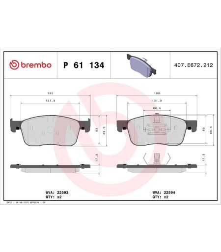 Breite [mm]: 180. Bremssystem: Teves. Dicke [mm]: 17, 18. Hersteller: BREMBO. Herstellernummer: P 61 134. Höhe [mm]: 70. Index: P 61 134. Linie: Prime line. Montage Achse: Vorne. Produktart: Bremsbelagsatz. Verschleißkontakt: Nein. WVA-Nummer: 22593 22594. ...