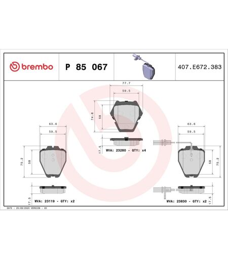 Anzahl Verschleißanzeiger [pro Achse]: 2. Anzahl der Beläge: 8. Breite [mm]: 64, 78. Bremssystem: Lucas. Dicke [mm]: 18, 19. Für bremsscheibendurchmesser [mm]: 321. Hersteller: BREMBO. Herstellernummer: P 85 067. Höhe [mm]: 75. Index: P 85 067. Linie: Prime line. Montage Achse: Vorne. Produktart: Bremsbelagsatz. Verschleißkontakt: Ja. WVA-Nummer: 23119,23280,23830. Warnkontaktlänge [mm]: 285. ...