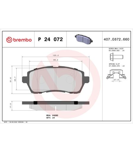 Anzahl Verschleißanzeiger [pro Achse]: 2. Anzahl der Beläge: 4. Anzahl der Federn: 4. Anzahl der Schrauben: 4. Breite [mm]: 126. Bremssystem: Lucas. Dicke [mm]: 18. Hersteller: BREMBO. Herstellernummer: P 24 072. Höhe [mm]: 52. Index: P 24 072. Linie: Prime line. Montage Achse: Vorne. Produktart: Bremsbelagsatz. Typprüfung: ECE R90 APPROVED. Verschleißkontakt: Nein. WVA-Nummer: 24283. ...