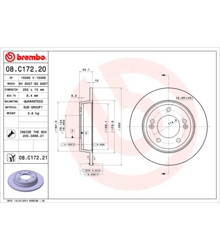 BREMBO Bremsscheibe Bremsscheibenart:Voll Ergänzungsartikel/Ergänzende Info 2:mit Schrauben Mindestdicke [mm]:8,4 mm Außendurchmesser [mm]:262 mm Bremsscheibendicke [mm]:10 mm Lochanzahl:5 Zentrierungsdurchmesser [mm]:76 mm Höhe [mm]:45 mmPreis pro Stück! Bremsscheiben müssen immer paarweise gewechselt werden. , u.a. für Hyundai I30 (GD), 1396 cm³, 99 PS (73 kW), 12/2011 bis 12/2015, KBA-Nr: 1349ACGHyundai I30 (GD), 1396 cm³, 90 PS (66 kW), 12/2011 bis 12/2016, KBA-Nr: 1349ACKHyundai I30 (GD), 1591 cm³, 120 PS (88 kW), 1/2012 bis 12/2016, KBA-Nr: 1349ACHHyundai Veloster (FS), 1591 cm³, 140 PS (103 kW), 3/2011 bis 12/2017, KBA-Nr: 8252AEXHyundai I30 (GD), 1591 cm³, 135 PS (99 kW), 12/2011 bis 12/2016, KBA-Nr: 1349ACJHyundai Elantra (MD, UD), 1797 cm³, 150 PS (110 kW), ab 9/2010KIA Cee'd (JD), 1396 cm³, 90 PS (66 kW), ab 5/2012Hyundai Elantra (MD, UD), 1582 cm³, 128 PS (94 kW), 2/2011 bis 12/2015, KBA-Nr: 8252AGAKIA Cee'd (JD), 1591 cm³, 204 PS (150 kW), ab 6/2013, KBA-Nr: 1260ADJKIA Cee'd (JD), 1396 cm³, 100 PS (73 kW), ab 5/2012, KBA-Nr: 1260ACUKIA Cee'd (JD), 1591 cm³, 135 PS (99 kW), ab 5/2012, KBA-Nr: 1260ACVKIA Cee'd (JD), 1396 cm³, 90 PS (66 kW), ab 5/2012, KBA-Nr: 1260ACWKIA Cee'd (JD), 1582 cm³, 128 PS (94 kW), ab 5/2012, KBA-Nr: 1260ACXHyundai I30 (GD), 1582 cm³, 128 PS (94 kW), 12/2011 bis 12/2015, KBA-Nr: 1349ACMHyundai Elantra (MD, UD), 1591 cm³, 128 PS (94 kW), 4/2011 bis 4/2016, KBA-Nr: 8252AHFHyundai I30 (GD), 1591 cm³, 129 PS (95 kW), 12/2011 bis 12/2015, KBA-Nr: 1349ACTHyundai Veloster (FS), 1591 cm³, 186 PS (137 kW), 10/2012 bis 12/2017, KBA-Nr: 8252AFSHyundai I30 (GD), 1396 cm³, 99 PS (73 kW), 6/2012 bis 12/2015, KBA-Nr: 1349ACUHyundai I30 (GD), 1591 cm³, 120 PS (88 kW), ab 6/2012, KBA-Nr: 1349ACVHyundai I30 (GD), 1591 cm³, 135 PS (99 kW), ab 6/2012, KBA-Nr: 1349ACWHyundai I30 (GD), 1396 cm³, 90 PS (66 kW), ab 6/2012, KBA-Nr: 1349ACXHyundai I30 (GD), 1582 cm³, 128 PS (94 kW), 6/2012 bis 12/2015, KBA-Nr: 1349ACYHyundai I30 (GD), 1582 cm³, 110 PS (81 kW), ab 6/2012, KBA-Nr: 1349ACZHyundai I30 (GD), 1591 cm³, 129 PS (95 kW), 6/2012 bis 12/2015, KBA-Nr: 1349ADAHyundai I30 (GD), 1582 cm³, 110 PS (81 kW), 12/2011 bis 12/2016, KBA-Nr: 1349ACLKIA Cee'd (JD), 1396 cm³, 100 PS (73 kW), ab 9/2012, KBA-Nr: 1260ACZKIA Cee'd (JD), 1591 cm³, 135 PS (99 kW), ab 9/2012, KBA-Nr: 1260ADAKIA Cee'd (JD), 1396 cm³, 90 PS (66 kW), ab 9/2012, KBA-Nr: 1260ADBKIA Cee'd (JD), 1582 cm³, 128 PS (94 kW), ab 9/2012, KBA-Nr: 1260ADCKIA Pro Cee'd (JD), 1396 cm³, 100 PS (73 kW), ab 3/2013, KBA-Nr: 1260ACUKIA Pro Cee'd (JD), 1591 cm³, 135 PS (99 kW), ab 3/2013, KBA-Nr: 1260ACVKIA Pro Cee'd (JD), 1396 cm³, 90 PS (66 kW), ab 3/2013, KBA-Nr: 1260ACWKIA Pro Cee'd (JD), 1582 cm³, 128 PS (94 kW), ab 3/2013, KBA-Nr: 1260ACXKIA Cee'd (JD), 1582 cm³, 110 PS (81 kW), ab 5/2012, KBA-Nr: 1260ACYHyundai Elantra (MD, UD), 1591 cm³, 132 PS (97 kW), 6/2011 bis 12/2015, KBA-Nr: 8252AFAKIA Pro Cee'd (JD), 1582 cm³, 110 PS (81 kW), ab 3/2013, KBA-Nr: 1260ACYKIA Cee'd (JD), 1582 cm³... ...