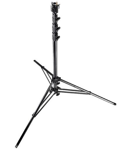Manfrotto Stativsortiment beinhaltet mehrere Produktlinien, die je nach vorgesehenem Einsatzzweck und der aufzunehmenden Scheinwerfertypen in Design und Materialauswahl differieren. Diese Supports lassen sich anhand der verwendeten Materialien und zweier Rohrtechnologien unterscheiden: elektrogeschweißtes Aluminium und Stahl. Besonderes Augenmerk wurde auf technische Mehrfachlösungen wie pneumatische Dämpfung und Ausgleichbeine gelegt, die diese Stative einzigartig machen. Die aktuellen Modelle erlauben Auslegerweiten von 21cm bis 550cm mit Nutzlasten von 1,5kg bis 200kg. Belastbarkeit in kg: 40, Maximale Belastbarkeit in voll ausgefahrenem Zustand (Neigung 5°): 12kg @ 477cm, Min. Höhe in cm: 144, Max. Höhe in cm: 477, Basedurchmesser in cm: 174 cm , Durchmesser geschlossen: 144cm, Socket size: Type 14 , Suggested wheels: 103, 104, 104G , Black chrome plated steel stand , 4 Sections, 3 Risers, Ø: 50, 45, 40, 35mm, Leg: Ø30 mm, 1 levelling leg, There is a reason we call this the super stand. Incredible reach of 477cm that can support fixtures up to 40kg ...