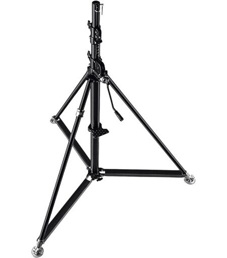 Manfrotto Stativsortiment beinhaltet mehrere Produktlinien, die je nach vorgesehenem Einsatzzweck und der aufzunehmenden Scheinwerfertypen in Design und Materialauswahl differieren. Diese Supports lassen sich anhand der verwendeten Materialien und zweier Rohrtechnologien unterscheiden: elektrogeschweißtes Aluminium und Stahl. Besonderes Augenmerk wurde auf technische Mehrfachlösungen wie pneumatische Dämpfung und Ausgleichbeine gelegt, die diese Stative einzigartig machen. Die aktuellen Modelle erlauben Auslegerweiten von 21cm bis 550cm mit Nutzlasten von 1,5kg bis 200kg. Belastbarkeit in kg: 80, Maximale Belastbarkeit in voll ausgefahrenem Zustand (Neigung 5°): 80kg @ 366cm, Min. Höhe in cm: 156, Max. Höhe in cm: 366, Basedurchmesser in cm: 180cm , Durchmesser geschlossen:179cm, Socket size: 28mm, Heavy lift stand with strenghtened stainless steel column and legs, chrome steel risers and geared column, Colour: black, 3 Sections Ø: 70, 60, 50mm, 2 risers extend simultaniously at an elevation of 4.4cm per handle turn, Safety cable ensures simultaneously retrieval of all sections , Rapid adjustment. Leg Ø: 35mm, Suggested wheels: 374, 1 levelling leg, Patented ...