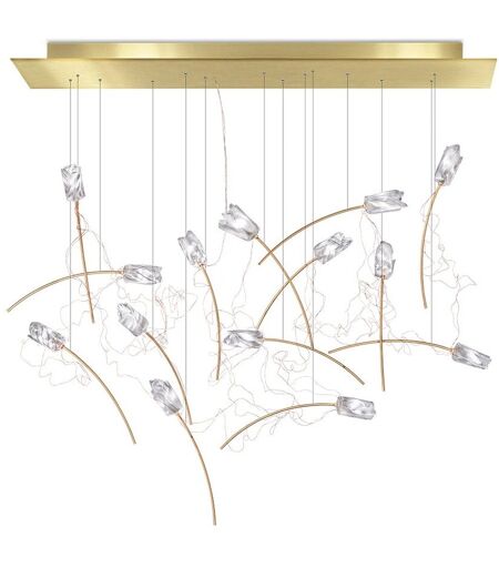 Elegant, leicht, traumhaft - die imposante Slamp Tulip 14 Linear Pendelleuchte von Designer Marc Sadler kleidet die Luft buchstäblich mit einer Abfolge von grazilen, leuchtenden Tulpen. Die Blütenkrone aus Lentiflex®, ein unzerbrechlicher, patentierter Kunststoff, wird von Hand im Slamp Atelier gefaltet und geformt und macht jede Blume zu einem Unikat. Der schillernde Effekt des Materials und die zarte Form bringen einen Hauch Eleganz in jeden Raum. Das teilweise unsichtbare Stahlseil hält die leuchtenden Blumen in der Luft, die aus Stängeln aus gebürstetem Messing erblühen. Die Tulpen der Tulip 14 Linear sind auf eine bestimmte Weise geneigt sind, um ein natürliches Aussehen nachzubilden. Jede Tulpe ist in Reihe mit der nächsten durch einen verdrehten und suggestiven dünnen Kupferdraht verbunden, in dem Elektrizität mit Niederspannung fließt.