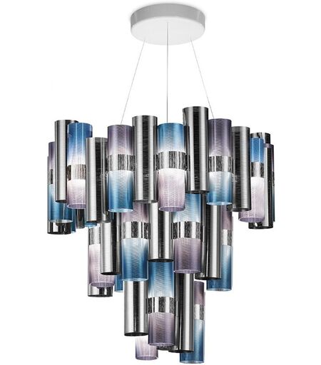 Die Slamp La Lollo Pendelleuchte der italienischen Designerin Lorenza Bozzoli überzeugt durch überragende Eleganz, effektvolle Dramatik und zauberhafte Farb- und Lichteffekte. Das außerordentliche Design ist ein Tribut an die herrlichen 50-er Jahre mit einem System von zylindrischen Aufhängungen in anmutiger Form, die Assoziationen mit dem Glamour und Blitzlichtern der Filmstars und Diven der damaligen Zeit weckt. Die Zylinder aus patentierten Technopolymeren der La Lollo Hängeleuchte werden um einen leuchtenden Ring in der Mitte sind auf unterschiedlichen Höhen angesiedelt und wechseln kaleidoskopartige Farben, Metallisierungen, Spitzenmotive, moderne Farbgradienten und geometrische Muster miteinander ab. Vollkommen im italienischen Slamp Atelier handgefertigt, werden die teiltransparenten Zylinder aus unzerbrechlichen, patentierten Technopolymer mit einem speziellen feinen Textur bedru... ...