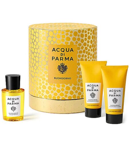 Ein festliches Buongiorno Geschenkset in einer Schachtel mit Cristina Celestinos ausdrucksstarken grafischen Neuinterpretation traditioneller Handwerkskunst, die die Vitalität neuer Anfänge in die Festzeit bringt. Duftfamilie: Zitrus, aromatisches Grün Kopfnoten: Zitronen-Essenz, Pfefferminz-Essenz, Rosmarin-Essenz, co-destillierte Basilikum- und Petitgrain-Essenzen Herznoten: Lavandin-Essenz, Mandarinenblätter-Akkord Basisnoten: Zedernblätter-Essenz, Ambra-Akkord, Akkord von weißem Moschus Das Trio umfasst ein 50 ml Buongiorno Eau de Parfum, 75 ml Buongiorno Hand- und Bodywash und 75 ml Buongiorno Hand- und Bodylotion. Sie werden in einer festlichen Schachtel mit dem Saisonmotiv von Acqua di Parma präsentiert – einem ausdrucksstarken grafischen Muster, das von traditioneller Handwerkskunst inspiriert sowie mit einem gehämmerten Gold-Effekt und einem farblich abgestimmten, geprägten Logo veredelt ist. Cristina Celestinos Unterschrift ziert die Oberseite der Schachtel und macht dieses Sammlerstück mit einer einzigartigen Design-Geste zu etwas Besonderem. Buongiorno Eau de Parfum: Buongiorno ist von den Hügeln der Toskana im Frühling inspiriert und ein Sinnbild der Vitalität neuer Anfänge, das durch eine strahlende Co-Destillation von Basilikum und Petitgrain entsteht – eine Feier der italienischen Freude an der Schönheit des Alltags. INGREDIENTS: Buongiorno EDP 20682: ALCOHOL DENAT. • PARFUM (FRAGRANCE) • AQUA (WATER) • LIMONENE • GERANIOL • LINALOOL • CITRAL • CITRONELLOL • COUMARIN Buongiorno Hand- und Bodywash 21219: AQUA (WATER) • DISODIUM COCOYL GLUTAMATE • COCAMIDOPROPYL BETAINE • DECYL GLUCOSIDE • PEG-40 HYDROGENATED CASTOR OIL • PEG-120 METHYL GLUCOSE DIOLEATE • GLYCERIN • PARFUM (FRAGRANCE) • PROPYLENE GLYCOL • DISODIUM LAURETH SULFOSUCCINATE • BENZOTRIAZOLYL DODECYL p-CRESOL • ETHYLHEXYL SALICYLATE • HYDROXYACETOPHENONE • CITRIC ACID • CHLORPHENESIN • TRISODIUM ETHYLENEDIAMINE DISUCCINATE • PANTHENOL • LIMONENE • OCTADECYL DI-T-BUTYL-4-HYDROXYHYDROCINNAMATE • GERANIOL • LINALOOL • CITRAL • POTASSIUM SORBATE • TOCOPHEROL • HELIANTHUS ANNUUS (SUNFLOWER) SEED OIL • CI 19140 (YELLOW 5) • CI 15985 (YELLOW 6) Buongiorno Hand- und Bodylotion 21226: AQUA (WATER) • GLYCERIN • DICAPRYLYL ETHER • ETHYLHEXYL STEARATE • ETHYLHEXYL PALMITATE • PARFUM (FRAGRANCE) • POLYSORBATE 20 • POLYACRYLATE-13 • HYDROXYACETOPHENONE • ALOE BARBADENSIS LEAF JUICE • CHLORPHENESIN • HYDROGENATED POLYISOBUTENE • ACRYLATES/C10-30 ALKYL ACRYLATE CROSSPOLYMER • CARBOMER • POLYSORBATE 80 • SODIUM HYDROXIDE • POLYGLYCERYL-10 LAURATE • LIMONENE • OCTADECYL DI-T-BUTYL-4-HYDROXYHYDROCINNAMATE • TETRASODIUM GLUTAMATE DIACETATE • SORBITAN ISOSTEARATE • GERANIOL • LINALOOL • CITRAL • CITRIC ACID • CITRONELLOL • TOCOPHEROL • SODIUM BENZOATE • POTASSIUM SORBATE Haftungsausschluss: Die Listen der Inhaltsstoffe der Acqua di Parma Produkte werden regelmäßig aktualisiert. Bevor Sie ein Produkt von... ...