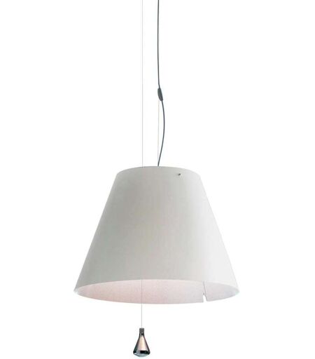 Entworfen in 2011 bei Paolo Rizzatto für den italienischen Leuchtenhersteller Luceplan, hat sich bei dem Design der Luceplan Lady Costanza Pendelleuchte im Gegensatz zur klassischen Costanza Leuchte nicht viel geändert - nur größer ist sie, mit einem Durchmesser von ca. 50cm. Dadurch passt die Luceplan Lady Costanza Pendelleuchte auch hervorragend über Ess- und Wohnzimmertische und besticht durch kontrastreiche Leichtigkeit und angenehmes, natürliches Licht.Der sehr leichte und auswechselbare Lampenschirm aus Polycarbonat ist in diversen Farben erhältlich und wird nur mittels zweier Aufnahmepunkte an der Leuchtmittelhalterung der Luceplan Lady Costanza Pendelleuchte befestigt. Es erscheint, als würde der Schirm im Raum sanft schweben. Das Kunststoffseil kann auf eine Länge von 100cm bis 220cm eingestellt werden. So kann die Leuchte problemlos auch in sehr höheren Räumen zum Einsatz komme... ...