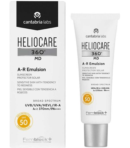 Anwendungsgebiet von Heliocare 360° A-R EmulsionHeliocare 360° A-R Emulsion ist ein hoher Sonnenschutz (UVA, UVB, HEVL, Infrarot-A Strahlung) welcher speziell für die Bedürfnisse von Patienten mit Rosazea oder zu Rötungen neigender Haut formuliert ist.