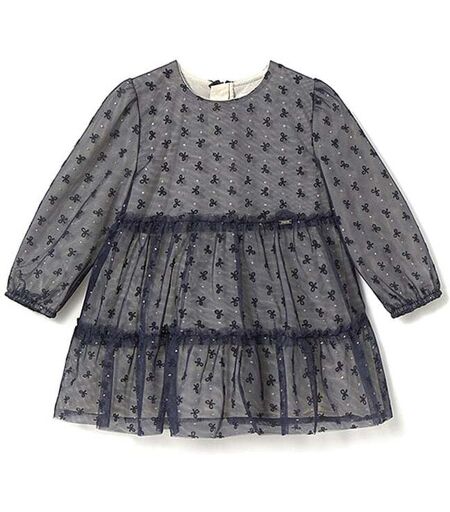 Baby Mädchen Kleid aus mit Volants aus Tüll Rundhalsausschnitt Schließt mit Druckknopfleiste in der hinteren Mitte Langarm mit elastischem Bündchen Tonales Allovermuster Volantbesatz am Saum Ausgestellte Passform Farbbezeichnung: Marine Material: 100% Polyester Futter: 100% Baumwolle ...