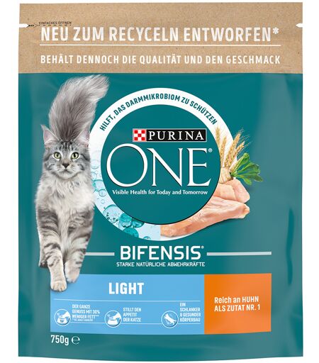 Ideal für Stubentiger, die es gern etwas ruhiger angehen: PURINA ONE Light ist ein ausgewogenes Trockenfutter mit einer Light-Rezeptur, das sich an ausgewachsene Katzen mit ein paar Pfunden zu viel auf den Hüften richtet. Es punktet mit erlesenen Zutaten wie schmackhaftem Huhn und einem reduzierten Energiegehalt, um das Gewichtsmanagement zu unterstützen. Damit eignet sich das Katzenfutter gut zur Gewichtskontrolle, ohne in Sachen Geschmack Abstriche machen zu müssen. PURINA ONE Light ist neben Huhn als 1. Zutat reich an wertvollen Inhaltsstoffen wie Omega-3- und -6-Fettsäuren, die Haut und Fell unterstützen können. Ein abgestimmter Nährstoff-Komplex dient der Unterstützung der körpereigenen Abwehrkräfte und einer ausgeglichenen Verdauung. Dank der vollwertigen Zusammensetzung eignet sich das Katzenfutter von PURINA ONE bestens dazu, den täglichen Nährstoffbedarf deiner Katze zu decken. PURINA ONE Light im Überblick: Leckeres Trockenfutter für Katzen .product-description__grid-wrapper { width:100%; display:inline-grid; grid-template-columns: 1fr 1fr; grid-gap: 20px; } @media (max-width: 500px) { .product-description__grid-wrapper { grid-template-columns: 1fr; } } Gewichtsmanagement Die kalorienreduzierte Rezeptur von PURINA ONE Light eignet sich besonders für Samtpfoten mit niedriger Aktivität, die Unterstützung beim Erreichen oder Halten ihres Idealgewichts benötigen. Geringerer Fettgehalt Das Trockenfutter enthält 30% weniger Fett im Vergleich zu PURINA ONE Adult. Dank hochwertiger sowie ausgesuchter Zutaten muss deine Katze aber keineswegs auf Genuss verzichten. Köstlicher Geschmack PURINA ONE Light enthält schmackhaftes Huhn als 1. Zutat und liefert deiner Samtpfote somit eine bekömmliche Quelle wertvoller Aminosäuren und hochwertiger Proteine für den Erhalt der schlanken Muskelmasse. Angepasster Eiweißgehalt Die Rezeptur versorgt deine Katze mit Proteinen in angemessener Menge, um eine optimale Körperkondition zu unterstützen. Gut sättigend: hilft dabei das Idealgewicht zu halten und trägt zur Gewichtskontrolle bei Mit pflanzlichen Beigaben: enthält Mais, getrockneten Chicorée und Rübentrockenschnitzel, ausgewogener Mix an Zutaten für eine vitalstoffreiche Ernährung Reich an Omega-3- und -6-Fettsäuren: kann zu normaler Haut und glänzendem Fell beitragen Enthält Taurin: essentielle Aminosäure für normale Sehkraft und Herzfunktion Bifensis-Formel: spezieller Nährstoff-Komplex, der die normale Funktion des Immunsystems unterstützen kann Gutes Komplettfutter: mit allen wichtigen Nähr- und Vitalstoffen, ideal für die tägliche Versorgung Recyclefähige Verpackung: neue Verpackung, einfach zu öffnen und wiederverwertbar ...