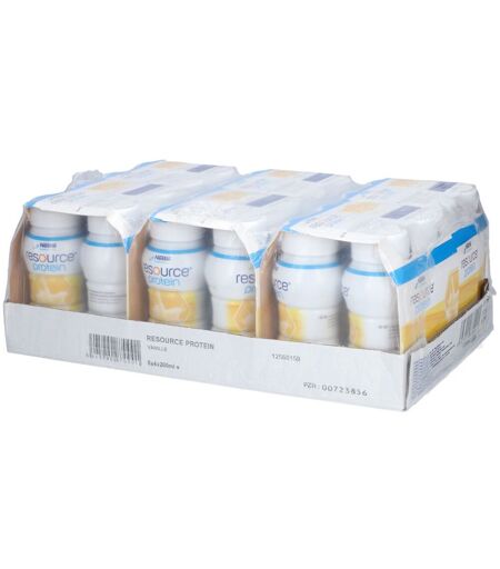 Nahrungsergänzungsmittel sind kein Ersatz für eine ausgewogene und abwechslungsreiche Ernährung und eine gesunde Lebensweise.resource® protein Vanille Hochkalorische Trinknahrung, reich an Eiweiß Aufbaukost bei MangelernährungGenießen Sie den leckeren Geschmack von resource® protein Vanille – die hochkalorische und proteinreiche Trinknahrung zum Diätmanagement bei bestehender Mangelernährung oder bei Risiko für eine Mangelernährung. Eine Flasche (200 ml) dieser medizinischen Trinknahrung liefert 250 kcal sowie 18,8 g Eiweiß und enthält alle wichtigen Nährstoffe wie Vitamine und Mineralstoffe. resource® protein Vanille eignet sich besonders gut für Patient:innen mit erhöhtem Eiweißbedarf. resource® protein mit Vanillegeschmack.Diese Trinknahrung eignet sich sowohl zur ergänzenden als auch zur ausschließlichen Ernährung und enthält keine Ballaststoffe. resource® protein Vanille schmeckt gekühlt am besten und kann leicht in den Alltag integriert werden. Lagern Sie das Produkt kühl und trocken, und schütteln Sie es gut vor dem Verzehr.Häufige Fragen:Wie viele Flaschen resource® protein sollte ich pro Tag trinken?Zur ergänzenden Ernährung sind täglich 1 – 3 Flaschen resource® protein zusätzlich zu Ihrer normalen Ernährung empfohlen. Achten Sie jedoch bitte darauf, die Dauer der Anwendung und Menge von resource® Trinknahrung - insbesondere bei ausschließelicher Ernährung - immer mit Ihrem Arzt zu besprechen. Wie nehme ich resource® Trinknahrungen zu mir?Für den besten Genuss empfehlen wir, resource® protein gekühlt zu trinken. Bitte schütteln Sie die Flasche vor dem Trinken gut durch. Die geöffnete Flasche wiederverschließen, im Kühlschrank aufbewahren und innerhalb von 24 Stunden verzehren.Für wen ist resource® protein geeignet?resource® protein ist geeignet ab 3 Jahren und für Personen mit Mangelernährung, ungewolltem Gewichtsverlust und/oder erhöhtem Energie- und Eiweißbedarf, wie etwa bei chronischen/konsumierenden Erkrankungen, nach Operationen, bei Dekubitus, gestörter Wundheilung oder altersbedingtem Muskelabbau.Kann ich resource® Trinknahrungen mit anderen Getränken oder Lebensmitteln mischen?Ja, Sie können resource® protein ganz nach Ihrem Geschmack mit anderen Getränken/Speisen mischen oder auch in Rezepten verarbeiten, z.B. als Soße zum Dessertgericht oder in den (Eis-)Kaffee als Milchersatz. Kann ich resource® Trinknahrungen erhitzen?resource® protein kann bedenkenlos bis maximal 40 °C erwärmt werden. Kann resource® protein vom Arzt verordnet werden?Ja, resource® protein Trinknahrung kann bei bestehender Mangelernährung oder bei Risiko für eine Mangelernährung zu Lasten der gesetzlichen Krankenkasse vom Arzt verordnet werden.Fußnote 1 Für resource® 2.0+fibre Neutraler Geschmack und resource® UTLRA fruit Orangen-Geschmack (im Vergleich zu den getesteten Wettbewerbsprodukten). Semimonadischer Produkttest n=73, Alter 65+, getestet wurden resource® 2.0+fibre Neutraler-/Kaffee-Geschmack, resource® energy Schokoladen-Geschmack, resource®... ...