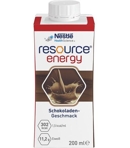 Anwendungsgebiet von Resource Energy SchokoladeResource Energy Schokolade:Zum Diätmanagement bei bestehender Mangelernährung oder bei Risiko für eine Mangelernährung und/oder:Erhöhtem Energie- und Nährstoffbedarf (z.B. bei konsumierenden Erkrankungen)Flüssigkeitsrestriktion (z.B. bei Herzinsuffizienz)Wirkstoffe / Inhaltsstoffe / ZutatenZutaten von Resource Energy Schokolade:Wasser, Glukosesirup, Milcheiweiß, pflanzliche Öle (Raps, Mais, Soja), Saccharose, fettarmes Kakaopulver (1,4 %), Mineralstoffe (Kaliumchlorid, Magnesiumchlorid, Natriumcitrat, Magnesiumoxid, Eisensulfat, Zinksulfat, Mangansulfat, Kupfersulfat, Natriumfluorid, Chromchlorid, Natriummolybdat, Kaliumiodid, Natriumselenat), Stabilisator (E339), Emulgator (E471), Vitamine (C, E, Niacin, Pantothensäure, B6, Thiamin, Riboflavin, A, Folsäure, K, Biotin, D, B12), Verdickungsmittel (E407), Aroma, Säureregulatoren (E330, E525).resource® energy Schokoladen-Geschmack100 mlBRENNWERTkJ / kcal637 / 151Fett, davon5,0 g– gesättigte Fettsäuren0,70 g– einfach ungesättigte Fettsäuren1,9 g– mehrfach ungesättigte Fettsäuren2,3 gKohlenhydrate, davon21 g– Zucker5,7 g– Lactose ...