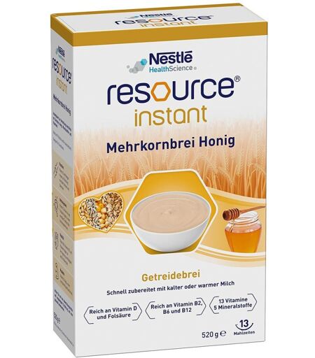 Anwendungsgebiet von Resource instant Mehrkornbrei Honig PulverResource instant Mehrkornbrei Honig PulverInstantpulver zur Herstellung eines Breis mit Getreide, Honig, Mineralstoffen und Vitaminen. Auch geeignet bei Kau- und Schluckstörungen sowie für die tägliche Nährstoffversorgung oder bei erhöhtem Nährstoffbedarf.Der Fettanteil ist mit 2,0 g/100 g geringSaccharose und Honig (10,5 %) sowie Kohlenhydrate aus den verwendeten GetreidebestandteilenDie Proteinkomponente stammt aus den hochwertigen GetreidequellenLiefert 4,0 g Ballaststoffe je 100 g PulverGeeignet für ErwachseneWirkstoffe / Inhaltsstoffe / ZutatenZutaten von Resource instant Mehrkornbrei Honig Pulver:Hydrolysiertes Mehl (88 %) (Weizen, Gerste, Roggen, Mais, Vollkornhafermehl), Honig (10,5 %) Zucker, Mineralstoffe (Calciumcarbonat, Mangansulfat, Kaliumiodid), Vitamine (Vitamin C, Niacin, Vitamin E, Pantothensäure, Vitamin B6, Thiamin, Riboflavin, Vitamin A, Folsäure, Vitamin K, Biotin, Vitamin D, Vitamin B12), Aromen. Kann Milch enthalten.GegenanzeigenBei bekannter Überempfindlichkeit gegenüber einen der oben genannten Inhaltsstoffe sollte dieses Produkt nicht angewendet werden.DosierungVerzehrempfehlung von Resource instant Mehrkornbrei Honig Pulver:Pro Portion 40 g Resource instant Mehrkornbrei Honig Pulver in 200 ml kalte oder warme Milch einrühren.1 bis 2 Portionen á 40 g pro Tag.Für die Zubereitung einer Portion langsam 40 g Resource instant Mehrkornbrei Honig Pulver in 200 ml kalte oder warme Milch einstreuen. Bis zur vollständigen Auflösung des Pulvers umrühren. Nach Belieben kann das Pulver (40 g) auch mit klaren Fruchtsäften (ohne Kohlensäure) angerührt werden. Für die Zubereitung als Getränk ist die Flüssigkeitsmenge pro Pulvermenge entsprechend zu erhöhen. Die Zubereitung mit Saft sowie die Erhöhung der Flüssigkeitsmenge bewirkt eine Änderung der Nährwerte. Für die Zubereitung mehrerer Portionen gleichzeitig empfiehlt sich die Verwendung eines Schneebesens ...