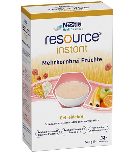 Anwendungsgebiet von Resource instant Mehrkornbrei Früchte PulverResource instant Mehrkornbrei Früchte PulverInstantpulver zur Herstellung eines Breis mit Getreide, getrockneten Früchten, Mineralstoffen und Vitaminen. Auch geeignet bei Kau- und Schluckstörungen sowie für die tägliche Nährstoffversorgung oder bei erhöhtem Nährstoffbedarf.Der Fettanteil ist mit 4,0 g/100 g geringKohlenhydrate aus den verwendeten GetreidebestandteilenDie Proteinkomponente stammt aus den hochwertigen GetreidequellenLiefert 6,5 g Ballaststoffe je 100 g PulverGeeignet für ErwachseneWirkstoffe / Inhaltsstoffe / ZutatenZutaten von Resource instant Mehrkornbrei Früchte Pulver:Hydrolysiertes Mehl (89 %) (Vollkornweizenmehl, Weizen, Vollkornhafermehl, Gerste, Roggen, Mais, Dinkel, Reis, Triticale), getrocknete Früchte (7 %) (Banane, Orange, Apfel), pflanzliche Öle (Rapsöl, Sonnenblumenöl), Mineralstoffe (Calciumcarbonat, Mangansulfat, Kaliumiodid), Vitamine (Vitamin C, Niacin, Vitamin E, Pantothensäure, Vitamin B6, Thiamin, Riboflavin, Vitamin A, Folsäure, Vitamin K, Biotin, Vitamin D, Vitamin B12), Aromen. Kann Milch enthalten.GegenanzeigenBei bekannter Überempfindlichkeit gegenüber einen der oben genannten Inhaltsstoffe sollte dieses Produkt nicht angewendet werden.DosierungVerzehrempfehlung von Resource instant Mehrkornbrei Früchte Pulver:Pro Portion 40 g Resource instant Mehrkornbrei Früchte Pulver in 200 ml kalte oder warme Milch einrühren.1 bis 2 Portionen á 40 g pro Tag.Für die Zubereitung einer Portion langsam Resource instant Mehrkornbrei Früchte Pulver in 200 ml kalte oder warme Milch einstreuen. Bis zur vollständigen Auflösung des Pulvers umrühren. Nach Belieben kann das Pulver (40 g) auch mit klaren Fruchtsäften (ohne Kohlensäure) angerührt werden. Für die Zubereitung als Getränk ist die Flüssigkeitsmenge pro Pulvermenge entsprechend zu erhöhen. Die Zubereitung mit Saft sowie die Erhöhung der Flüssigkeitsmenge bewirkt eine Änderung der N ...