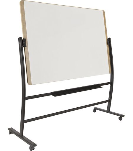 Mobiles Whiteboard NATURAL, Stahl, lackiert, HxBxT 1720 x 1620 x 640 mm. Anlieferung = zerlegt. Oberfläche = lackiert. Eigenschaft = beidseitig beschreibbar, fahrbar, magnethaftend. Ausstattung = Ablageschale. Radausstattung = 4 Doppel-Lenkrollen mit Feststeller. Breite = 1620 mm. Höhe = 1720 mm. Tafelfarbe = weiß. Tafelmaterial = Stahlblech, Melaminholz. Tafelhöhe = 1000 mm. Tiefe = 640 mm. Rahmenstärke = 19 mm. Tafelbreite = 1500 mm. Rahmenfarbe = hellbraun. Gestellfarbe = schwarz. Rahmenmaterial = Melaminholz. Gestellmaterial = Stahl. Gewicht = 33 kg. Edles und modernes Design in Holzoptik. Lackierte Tafeloberfläche beidseitig magnethaftend, beschriftbar mit trocken abwischbaren Boardmarkern. Beidseitig verwendbar, drehbar, in jeder Position arretierbar. Mobil auf 4 Doppel-Lenkrollen, für leichtes Umstellen und Verfahren der Wand. Als Schreibtafel, Info- oder QS-Board, Schulung, Moderation, Präsentation nutzbar. Ein exklusives, mobiles Whiteboard der Serie NATURAL, bei der die Tafel auf eine Melaminholzplatte aufgebracht ist. Stabiles Fahrgestell aus Stahl, schwarz lackiert mit praktischer Ablageschale für Boardmarker und Tafelzubehör. ...