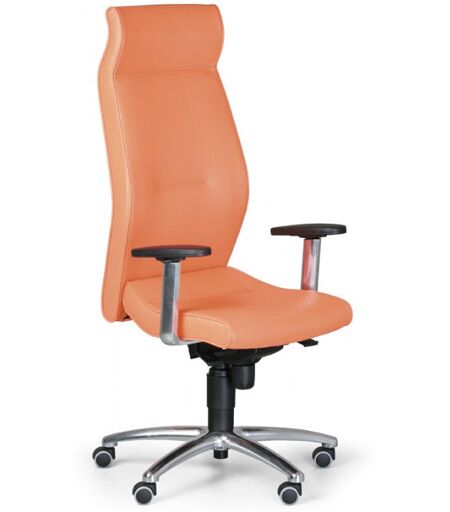 Bürostuhl MEGA mit Bezug aus echtem Leder an beanspruchten Stellen, Seiten und Rückseite aus Ökoleder synchrone Mechanik mit hervorragenden ergonomischen Eigenschaften, die die Neigung der Rückenlehne an die Neigung des Sitzkissens anpasst fortschrittliche 3D Kunststoffarmlehnenmit verstellbarer Höhe, Tiefe und Rotation Sitzfläche mit einer Breite von 50 cm und einer Tiefe von 48 cm, Rückenlehne mit einer Höhe von 77 cm Aluminiumkreuz, Tragfähigkeit 150 kg Rollen für harte Böden (z.B. Schiffböden, Fliesen, Beton, usw.) Eigenschaften: Farbe: orange, Tragfähigkeit (kg): 150, Rollen: weich für harte Böden, Kreuz: Aluminium, Sitzflächenmaterial: echtes Leder, Rückenlehnenmaterial: echtes Leder, Gesamthöhe (cm): 124 - 131, Sitzflächenhöhe (cm): 44 - 51, Sitzflächentiefe (cm): 48, Sitzflächenbreite (cm): 50, Rückenlehnenhöhe (cm): 77, Lordosenstütze: Nein, Kopfstütze: Nein, Mechaniktyp: Synchronmechanik, Armlehnentyp: Plastik mit Höhenseinstellung, breiten und Tiefe, Bezugsmaterial: echtes Leder, Höhe Armlehne über Sitzfläche (cm): 18 - 25, Sitzfüllmaterial: Kaltschaum in die Form gespritzt, Höhenverstellbare Rückenlehne: Nein, Füllmaterial Rückenlehne: Kaltschaum in die Form gespritzt, Unterste Höhe Armlehne oberirdisch (cm): 61, Breite inkl. der Armlehnen (cm): 67, Arretierung: in 5 Punkten, Balancefunktion: Nein, Armlehnenmaterial: plastik, Höhenverstellbare Armlehnen: Ja, Tiefenverstellbare Armlehnen: Ja, Armlehnendrehung: Ja, Klappbare Armlehnen: Nein, Kreuzdurchmesser (cm): 70, Armlehnen zur Sitzverlängerung: Nein, Min. Sitzhöhe (cm): 44, Max. Sitzhöhe (cm): 51, Abnehmbar der Armlehnen: Ja, Armlehnen: Ja ...