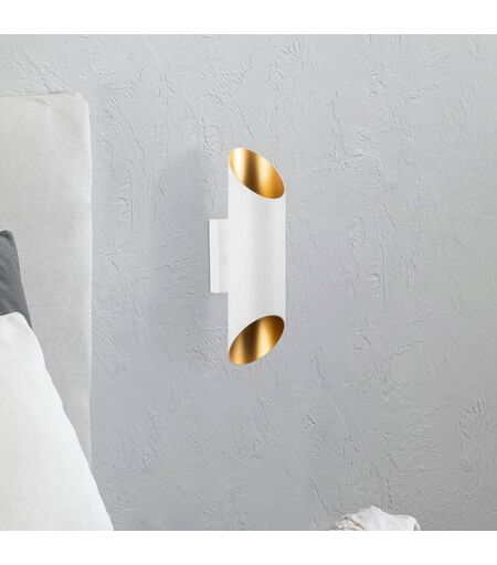 Die weiße Wandleuchte Cut 11815 aus Metall ist mit einem zylindrischen Korpus ausgestattet. Dieser ist am oberen und unteren Ende abgeschrägt und innen mit einem goldenen Finish versehen. Das Licht wird nach oben und unten ausgestrahlt. ...