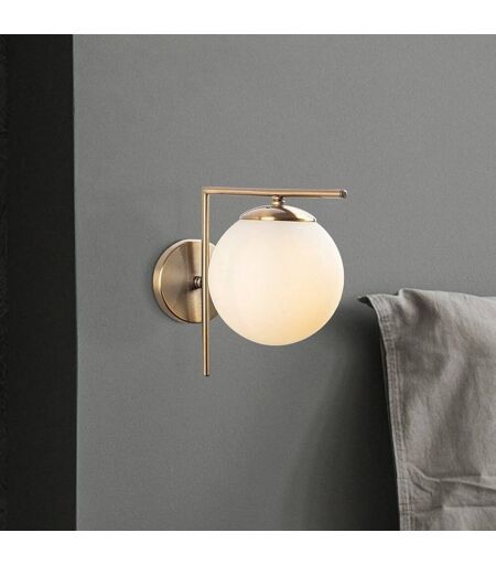 Die Wandleuchte 7141-Antique ist mit einem kugelförmigen Lampenschirm aus Opalglas ausgestattet. Der rechtwinklige Ausleger sowie die runde Wandbefestigung sind aus Metall in antik-goldenem Finish gearbeitet. ...