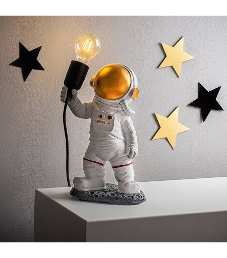 Die Tischleuchte Astronaut-1 aus Polyester ist ein dekorativer Zusatzlichtspender für Innenräume, der neben dem Wohn- und Esszimmer auch im Kinderzimmer zum Einsatz kommen kann. Die Astronautenfigur hält eine Lampenfassung, die mit dem gewünschten Leuchtmittel bestückt werden kann. ...