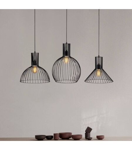 Die dreiflammige Hängeleuchte Fellini MR-768 ist mit Lampenschirmen aus Eisenstreben in schwarzem Finish ausgestattet. Die drei Lampenschirme weisen dabei unterschiedliche Formen auf - Halbkugel, Kugel und Kegel. ...