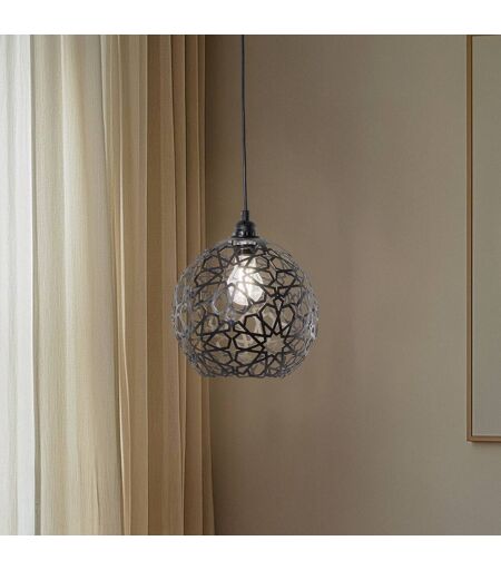 Der schwarze Schirm der Hängeleuchte Fellini MR-785 ist aus Metall gefertigt. Zahlreiche, verwinkelt verlaufende Streben bilden eine runde Sphäre mit charakteristischem Muster. ...