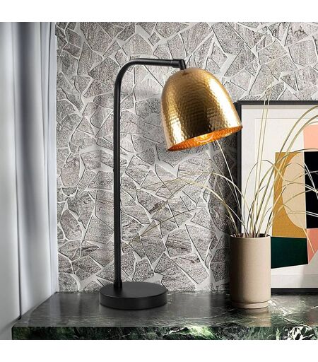Die Tischleuchte Tattoo 5031 aus Metall ist mit einem schwarzen Gestell ausgestattet, das einen Lampenschirm im antiken Goldfinish trägt. Dessen Lichtaustritt ist schräg nach unten gerichtet. ...