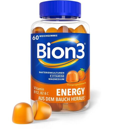 Bion3® Energy Weichgummis, Multivitamine mit Bakterienkulturen, Vitamin B12, C, D und Magnesium Halte dein Energiezentrum den ganzen Tag aufgeladen mit den neuen Bion3® Energy Weichgummis – Energie1 aus dem Bauch heraus2Jeder Mensch braucht Energie für sein Leben! Aber du kannst keine Energie haben, wenn du dich nicht um den Darm kümmerst! Der Darm ist von zentraler Bedeutung für den Energiestoffwechsel, denn hier werden wichtige Nährstoffe wie Vitamine und Mineralstoffe aufgenommen. Energie1 aus dem Bauch heraus2!Die neuen Bion3® Energy1 Weichgummis haben eine einzigartige Rezeptur mit einer Kombination aus Mineralstoffen und Vitaminen, die den Darm unterstützen und dafür sorgen, dass dein Energielevel den ganzen Tag hoch bleibt1,2 und mit Bakterienkulturen. Jedes leckere Weichgummi mit Orangengeschmack enthält 8 wichtige Vitamine, darunter B1, B2, Niacin, B6, Biotin und B12 zur Unterstützung des Energiestoffwechsels sowie Vitamin C und Magnesium zur Verringerung von Müdigkeit und Ermüdung. Darüber hinaus enthalten Bion3® Energy1 Weichgummis die Vitamine B2, Niacin und Biotin zur Unterstützung des Darms2 sowie 150 Millionen Bakterienkulturen (B. coagulans), die ausgewählt wurden, dass sie den Darm lebend erreichen.Auf einem Blick: Vitamine B2, Niacin und Biotin unterstützen den Darm2. Vitamine B12, B1 und B6 unterstützen den Energiestoffwechsel2. Vitamin C und Magnesium verringern Müdigkeit und Erschöpfung1. Bakterienkulturen (B. coagulans) unterstützen das Gleichgewicht der Darmflora. Bion3® Energy1 Weichgummis sind vegetarisch, gluten- und laktosefrei und wurden ohne tierische Gelatine und künstliche Aromen, Farbstoffe und Süßungsmittel hergestellt. Erwachsene (ab 18 Jahren): 1-2 Weichgummis täglich.Warnhinweise:Erwachsene (ab 18 Jahren): Die empfohlene tägliche Verzehrsmenge nicht überschreiten. Nahrungsergänzungsmittel sind kein Ersatz für eine ausgewogene, abwechslungsreiche Ernährung und einen gesunden Lebensstil.Verzehrempfehlung:Erwachsene (ab 18 Jahren): 1-2 Weichgummis täglich. Kein Wasser erforderlich. Die empfohlene tägliche Verzehrsmenge nicht überschreiten. Nahrungsergänzungsmittel sind kein Ersatz für eine ausgewogene, abwechslungsreiche Ernährung und einen gesunden Lebensstil. Zutaten:Glukosesirup; Zucker; Magnesiumcitrat; Wasser; Vitamin C (L-Ascorbinsäure); Geliermittel: Pektin; Maltodextrin; Niacin (Nicotinamid); Säureregulatoren: Natriumascorbat, Trinatriumcitrat; Bakterienstamm Bacillus coagulans SNZ 1969; Natürliches Orangenaroma; Modifizierte Stärke; Vitamin B6 *Gutschein gültig bei Online-Bestellung für die folgenden Produkte des Herstellers WICK Pharma - Zweigniederlassung der Procter & Gamble GmbH: 11587184, 18010795, 18010789, 18010737, 18010743, 18860200, 18860192, 08110572, 08110571, 11587178 (ausgenommen Artikel von Drittanbietern (Marktplatz Partnern) sowie bei einer Now!-Lieferung). Voraussetzung ist die Angabe des Gutschein-Codes. Nur ein Gutschein pro Bestellung. Gutschein nur einmal pro Kund:in verwendbar.... ...
