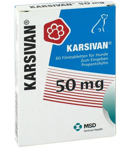 Anwendungsgebiet von Karsivan 50 veterinär FilmtablettenKarsivan 50 veterinär Filmtabletten wurde speziell für ältere Hunde entwickelt. Sie dienen der Behandlung von peripheren und zerebralen Durchblutungsstörungen. Dies kann die Vitalität und Lebensqualität Ihres Tieres bis ins hohe Alter hinein fördern. Einer Medikation sollte immer eine tierärztliche Untersuchung/Behandlung vorausgehen. Spezifische Organerkrankungen müssen ursächlich behandelt werden.Wirkungsweise von Karsivan 50 veterinär FilmtablettenDer in den Karsivan 50 veterinär Filmtabletten enthaltene Wirkstoff Propentofyllin verbessert die Durchblutung perpherer und zerebraler Gewebe und begünstigt die Fließeigenschaften des Blutes. Dadurch wird die Sauerstoffversorgung von Gehirn, Herz, Muskulatur und anderen lebenswichtigen Organen nachweisbar gesteigert. Auch Zustände einer altersbedingten Versteifung, Appetitmangel und Trägheit wurden durch eine Behandlung mit Karsivan 50 veterinär Filmtabletten nachweislich gebessert. In therapeutischen Dosen gelten die Karsivan 50 veterinär Filmtabletten als gut verträglich.Wirkstoffe / Inhaltsstoffe / Zutaten1 Tablette der Karsivan 50 veterinär Filmtabletten enthält als wirksamen Bestandteil: 50 mg Propentofyllin GegenanzeigenBei bekannter Überempfindlichkeit gegen den Wirkstoff, bei trächtigen Hündinnen, bei Zuchttieren und bei Tieren, die der Lebensmittelgewinnung dienen, darf das Produkt nicht angewendet werden. DosierungDie empfohlene Einzeldosierung pro kg Körpergewicht (KG) eines Hundes beträgt 3 mg des Wirkstoffes. Diese wird 2x täglich verabreicht. Daraus ergibt sich, soweit nicht anders verordnet, folgendes Dosierschema: bis zu 4 kg KG: 2x täglich 1/4 Tablette 5-8 kg KG: 2x täglich 1/2 Tablette 9-15 kg KG: 2x täglich 1 Tablette 16-25 kg KG: 2x täglich 1 ½ Tabletten 26-33 kg KG: 2x täglich 2 Tabletten 34-50 kg KG: 2x täglich 3 Tabletten Die Tablette ...