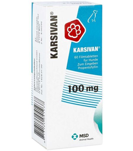 Anwendungsgebiet von Karsivan 100 veterinär FilmtablettenKarsivan 100 veterinär Filmtabletten wurde speziell für ältere Hunde entwickelt. Sie dienen der Behandlung von peripheren und zerebralen Durchblutungsstörungen. Dies kann die Vitalität und Lebensqualität Ihres Tieres bis ins hohe Alter hinein fördern. Einer Medikation sollte immer eine tierärztliche Untersuchung/Behandlung vorausgehen. Spezifische Organerkrankungen müssen ursächlich behandelt werden.Wirkungsweise von Karsivan 100 veterinär FilmtablettenDer in den Karsivan 100 veterinär Filmtabletten enthaltene Wirkstoff Propentofyllin verbessert die Durchblutung perpherer und zerebraler Gewebe und begünstigt die Fließeigenschaften des Blutes. Dadurch wird die Sauerstoffversorgung von Gehirn, Herz, Muskulatur und anderen lebenswichtigen Organen nachweisbar gesteigert. Auch Zustände einer altersbedingten Versteifung, Appetitmangel und Trägheit wurden durch eine Behandlung mit Karsivan 100 veterinär Filmtabletten nachweislich gebessert. In therapeutischen Dosen gelten die Karsivan 100 veterinär Filmtabletten als gut verträglich.Wirkstoffe / Inhaltsstoffe / Zutaten1 Tablette der Karsivan 100 veterinär Filmtabletten enthält als wirksamen Bestandteil: 100 mg Propentofyllin GegenanzeigenBei bekannter Überempfindlichkeit gegen den Wirkstoff, bei trächtigen Hündinnen, bei Zuchttieren und bei Tieren, die der Lebensmittelgewinnung dienen, darf das Produkt nicht angewendet werden.DosierungDie empfohlene Einzeldosierung pro kg Körpergewicht (KG) eines Hundes beträgt 3 mg des Wirkstoffes. Diese wird 2x täglich verabreicht. Daraus ergibt sich, soweit nicht anders verordnet, folgendes Dosierschema: 9-15 kg KG: 2x täglich 1/2 Tablette 16-32 kg KG: 2x täglich 1 Tablette 33-50 kg KG: 2x täglich 1 ½ Tabletten Die Tabletten können direkt, in einem Futterbällchen oder zerkleinert mit dem Futter eingegeben werden. Karsivan 100 veterinär Fil ...