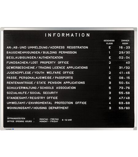 Erleben Sie folgende Features:Zum Anzeigen von Nachrichten, Menüs, Ankündigungen oder Wegbeschreibungen Blickfang mit Retro-Charme für Ihr Zuhause, Büro oder Café Buchstaben leicht anzubringen und auszutauschen Buchstaben werden sicher an der Tafel befestigt Einfache Wandmontage: flexible Montage durch verdecktes Langlochsystem Schwarze Tafeloberfläche mit Gummiriffelung Aluminiumrahmen mit hellgrauen Kunststoffecken Lieferung inklusive Montageset und Montageanleitung ...