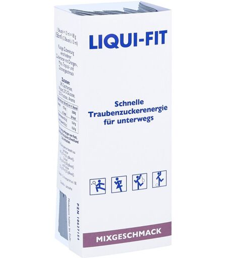 Anwendungsgebiet von Liqui Fit Geschmacksmix flüssige Zuckerlösung BeutelLiqui Fit Geschmacksmix flüssige Zuckerlösung Beutel Kein Kauen – Folie aufreißen – Trinken Die praktischen Liqui Fit Geschmacksmix flüssige Zuckerlösung Beutel Folienbeutel lassen sich überall hin mitnehmen. Die unentbehrlichen Begleiter sind unempfindlich gegenüber Druck und Feuchtigkeit und somit auch beim Sport die robuste Alternative zu Traubenzuckertäfelchen. So ist die Energiereserve immer griffbereit, wenn man sie benötigt. Liqui Fit Geschmacksmix flüssige Zuckerlösung Beutel ist eine flüssige Zubereitung verschiedener Zuckerarten mit Mixgeschmack. Wirkstoffe / Inhaltsstoffe / ZutatenLiqui Fit Geschmacksmix flüssige Zuckerlösung Beutel enthält: 34% Saccharose, Wasser, 21% Glucose, 20% Fructose, Aroma Nährwert pro 100 ml pro Beutel = 13 ml Energie 1753 kJ / 413 kcal 228 kJ / 54 kcal Kohlenhydrate 103,2 g 13,4 g davon Zucker 103,2 g 13,4 g Kann geringe Mengen von Fett, gesättigten Fettsäuren, Eiweiß und Salz enthalten. Das Zuckerspektrum besteht aus Saccharose 46,7 g / 100ml, Glucose 29,4 g / je 100 ml und Fructose 27,2 g / 100 ml GegenanzeigenBei bekannter Überempfindlichkeit gegenüber einem der oben genannten Inhaltsstoffe sollte dieses Produkt nicht angewendet werden. DosierungAnwendungsempfehlung von Liqui Fit Geschmacksmix flüssige Zuckerlösung Beutel: Bei Bedarf einen Beutel einnehmen. Eine Perforation am Beutel ermöglicht eine leichte und schnelle Öffnung. Durch die flüssige Konsistenz von Liqui Fit Geschmacksmix flüssige Zuckerlösung Beutel wird die Einnahme wesentlich vereinfacht, ohne zu kauen oder Wasser nach zu trinken wird der Inhalt geschluckt. HinweiseNahrungsergänzungsmittel sind kein Ersatz für eine ausgewogene und abwechslungsreiche Ernährung. Bei Raumtemperatur, trocken, stets verschlossen und außerhalb der Reichweite von Kinde ...