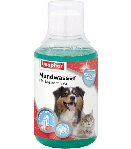 Anwendungsgebiet von Beaphar Mundwasser für Hunde und KatzenBeaphar Mundwasser für Hunde und Katzen bekämpft Bakterien auch an Stellen, die die Zahnbürste nicht erreicht, und trägt so zu einer effektiven Zahnhygiene bei Hunden und Katzen bei. Es schützt Zähne und Zahnfleisch, reduziert unangenehmen Maulgeruch, wirkt gegen Plaque, beugt Zahnstein vor und sorgt für frischen Atem.Wirkstoffe / Inhaltsstoffe / ZutatenBeaphar Mundwasser für Hunde und Katzen enthält:Aqua, Glycerin, Peg-10 Castor Oil, Menthol, Potassium Sorbate, Zinc Lactate, Phosphoric Acid, Alcohol, Propylene Glycol, Chlorhexidine Digluconate, Echinacea Purpurea, Subtilisin, Ci 42090, Ci 19140, Sodium Chloride.GegenanzeigenBei bekannter Überempfindlichkeit gegenüber einem der oben genannten Inhaltsstoffe sollte dieses Produkt nicht angewendet werden.DosierungAnwendungsempfehlung von Beaphar Mundwasser für Hunde und Katzen: Vor Gebrauch gut schütteln.Beim ersten Gebrauch nur die Hälfte der empfohlenen Dosierung in das Trinkwasser geben, damit sich das Tier an den Duft des Mundwassers gewöhnen kann. Bei den darauffolgenden Anwendungen die Dosierung auf täglich 10 ml Mundwasser pro 1 Liter Trinkwasser anheben. Das Trinkwasser alle 24 Std. austauschen. Nicht unverdünnt verabreichen.HinweiseNicht unverdünnt verabreichen. Nicht überdosieren. Vor Gebrauch gut schütteln. Für Kinder unzugänglich aufbewahren. Nicht für den menschlichen Gebrauch geeignet. Unter 25 °C lagern. Beaphar Mundwasser für Hunde und Katzen können in Ihrer Versandapotheke www.juvalis.de erworben werden. ...