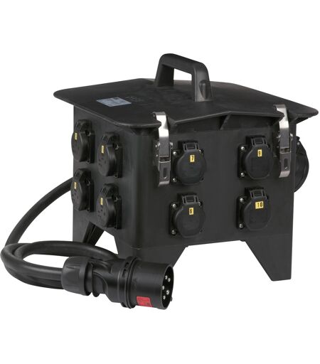 Gummigehäuse tragbar, stabil und stapelbar, Integrierter Tragegriff, Staubabweisend und spritzwasserfest, Klappdeckel mit 2 Schnellverschlüssen, Technische Daten: Nenn Strom A: 32 A, Stromeingangsstecker: CEE5P 32 A, Stromausgangs Stecker: CEE5P 16 A / Schuko Socket, MCB-Nennstrom: 16 A, MCB Klasse: Class C, rccb Klasse: A, rccb Empfindlichkeit: 30 mA, Länge (mm): 320 mm, Höhe (mm): 320 mm, Breite (mm): 320 mm, Gewicht: 11 kg, IP-Schutzklasse: IP54, Gehäusematerial: Rubber ...