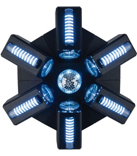 Einzigartiger All-in-One 6x RGBW-Spiegelkugel-Lichteffekt/Multi-Effekt, Breiter Reflexionswinkel von 160° – ideal für niedrige Decken, Sechs RGB-Stimmungs-/Effektstreifen, DMX, Standalone und Tonsteuerung, Der Showtec Typhoon 640 bietet einzigartige Lichteffekte durch sechs kreisförmige 40W-RGBW-LEDs, die nach innen auf eine mittig positionierte, rotierende Halbspiegelkugel gerichtet sind. Die sechs RGBW-LEDs können einzeln gesteuert werden und die Geschwindigkeit und Richtung der Halbspiegelkugel kann kontrolliert werden, um einzigartige, bunte Muster zu erzeugen. Jedes der sechs RGBW-LED-Gehäuse enthält außerdem einen RGB-LED-Effektstreifen, der individuell gesteuert werden kann, aber auch verschiedene Shows anzeigen kann, die ausgewählt werden können, um unterhaltsame Muster und Effekte darzustellen. Er ist konvektionsgekühlt und dadurch geräuscharm.Das niedrige Profil und der breite Abstrahlwinkel des Typhoon 640 machen ihn ideal für Räume mit niedrigen Decken, aber er kann auch vertikal (oder in jedem anderen Winkel) montiert werden, um kreative und schillernde Effekte zu erzielen. Er verfügt über 4-, 16-, 31-, 36- und 51-Kanal-DMX-Modi, kann aber auch im Standalone-Betrieb und mit Klang aktiviert werden.Technische Daten: Leuchtmittel Typ: LED, Anzahl Leuchtmittel: 6, Lichtquelle Anzahl (Effekt): 60, Lichtquelle Leistung: 40 W, Lichtquelle Leistung (Effekt): 0.3 W, LED Farbe: RGB / RGBW, Steuermodus: DMX / Manual / Master Slave / Sound, DMX-Kanäle: 4 / 16 / 31 / 36 / 51, Protokolle: DMX, Stromversorgung: 100-240 V AC 50/60 Hz, Stromverbrauch: 138 W, Stromeingang: IEC, Stromanschluss Ausgang: IEC, DMX-Anschluss: XLR 3P In/Out, Höhe (mm): 219 mm, Breite (mm): 452 mm, Tiefe (mm): 431 mm, Gewicht: 4.8 kg, IP-Schutzart: IP20 (indoor use only), Gehäuse: ABS / Metal, Farbe: Black ...