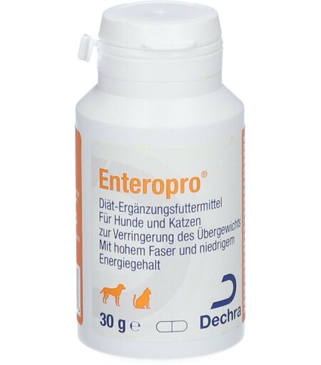 Ergänzungsfuttermittel für Hunde und Katzen Enteropro® Diät-Ergänzungsfuttermittel für Hunde und Katzen zur Verringerung des Übergewichts. Mit hohem Faser- und niedrigem Energiegehalt. Zieltierart: Hunde und Katzen. Fütterungsempfehlung: Bis zum Erreichen des angestrebten Fütterungszieles erhalten täglich: Katzen: ½–1 Kapsel Hunde 5 kg: 1–1½, 10 kg: 2–3, 20 kg: 4–6, 30 kg: 6–9 Kapseln. Nach dem Öffnen der Kapsel wird der Inhalt mit dem gewohnten Futter vermischt. Es ist sinnvoll, zunächst mit der niedrigen Menge zu beginnen. Bei Fütterung mehrerer Mahlzeiten am Tag ist es sinnvoll, die täglich empfohlene Enteropro®-Menge auf die Portionen aufzuteilen. Bei übergewichtigen Tieren ist es meist sinnvoll, das Grundfutter (die gewohnte Nahrung) etwas zu reduzieren. Sie sollten Ihr Tier zur Kontrolle wöchentlich wiegen. Anzustreben ist eine langsame Gewichtsreduktion auf das tierärztlich empfohlene Gewicht. Frisches Trinkwasser soll jederzeit für das Tier erreichbar sein. Die drei pflanzlichen Zutaten sind in Enteropro® sorgfältig aufeinander abgestimmt. Gemeinsam bewirken sie durch Wasserbindung eine Volumenzunahme des Nahrungsbreis im Verdauungstrakt und fördern so die Sättigung. Zusammensetzung: Flohsamenschalen 80 %, Apfeltrester 10 %, Zitrustrester 10 %. Analytische Bestandteile und Gehalte: 17,4 % Rohprotein, 1,1 % Rohfett, 4,4 % Rohfaser, 2,5 % Rohasche. Zusatzstoffe je kg: Ernährungsphysiologische Zusatzstoffe: Ballaststoffe (gesamt) 78,5 %. ...