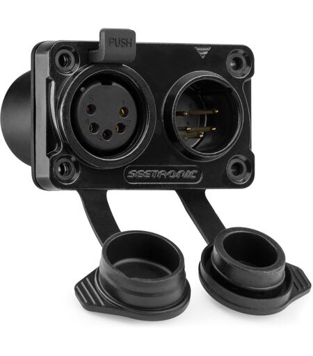 Umrüstsatz mit einem männlichen und einem weiblichen 5-Pin-XLR-Einbaustecker als Ersatz für die 3-Pin-Einbaustecker. IP65-Schutz, wenn ein geeignetes IP65-Gegenstück verwendet wird.Umrüstsatz für 5-polige Chassisbuchsen (Stecker und Buchse), Wasserdicht und stoßfest, Lieferung mit Gummidichtungen / Verschlusskappen, Verriegelungsmechanismus, Schwarz beschichtete Zinklegierungsdruckgussschalen, Vergoldete Kontakte, Kompatibel mit 150.730 MKII, 150.732 MKII, 150.734, 150.736, 150.753, 150.754, Technische Daten: Produktfarbe: Schwarz, Schutzart: IP65, Wählen Sie beide Stecker: 5-polig XLR IP65 (M), 5-polig XLR IP65 (F), Gewicht (kg): 0.0800 ...