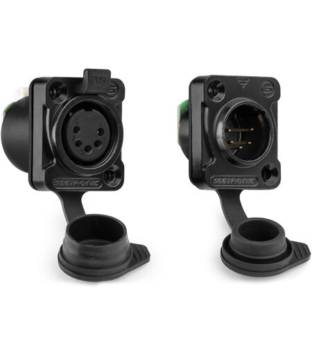 Umrüstsatz mit einem männlichen und einem weiblichen 5-Pin-XLR-Einbaustecker als Ersatz für die 3-Pin-Einbaustecker. IP65-Schutz, wenn ein geeignetes IP65-Gegenstück verwendet wird.Umrüstsatz für 5-polige Chassisbuchsen (Stecker und Buchse), Wasserdicht und stoßfest, Lieferung mit Gummidichtungen / Verschlusskappen, Verriegelungsmechanismus, Schwarz beschichtete Zinklegierungsdruckgussschalen, Vergoldete Kontakte, Kompatibel mit 150.454, 150.730, 150.732, 150.790, 150.792, 150.796, 153.305, Technische Daten: Produktfarbe: Schwarz, Schutzart: IP65, Wählen Sie beide Stecker: 5-polig XLR IP65 (M), 5-polig XLR IP65 (F), Gewicht (kg): 0.0850 ...