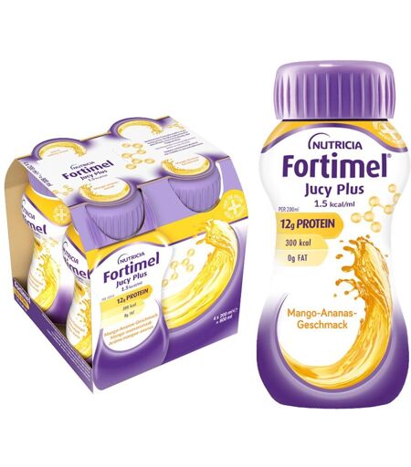 Anwendungsgebiet von Fortimel Jucy Plus Mango AnanasFortimel® Jucy Plus Mango Ananas – Hochkalorische Trinknahrung mit vielen wichtigen Nährstoffen – 300 kcal und 12 g Eiweiß pro Flasche – 4 x 200 ml. Fortimel Jucy Plus Mango Ananas ist eine hochkalorische Trinknahrung ohne Fett mit fruchtigem Geschmack. Sie ist reich an wichtigen Nährstoffen und wurde entwickelt, damit Sie wieder zu Kräften kommen. Die fruchtig-klare Fortimel® Jucy Plus Trinknahrung ist direkt verzehrfertig und praktisch für unterwegs – schmeckt besonders gut gekühlt und gemischt mit Sprudelwasser als Schorle. Dieses Produkt ist für das Diätmanagement bei krankheitsbedingter Mangelernährung bestimmt, insbesondere bei erhöhtem Energiebedarf, Appetitlosigkeit, Malassimilationssyndrom oder Fettverwertungsstörungen (Pankreatitis). Es eignet sich auch für Patienten, die eine Abneigung gegen Milchprodukte haben. Es ist wichtig zu beachten, dass Fortimel® Jucy Plus nicht für Kinder unter 3 Jahren geeignet ist und bei Kindern ab 3 Jahren nur unter besonderer Vorsicht und regelmäßiger ärztlicher Kontrolle verwendet werden sollte. Es ist auch kontraindiziert für Patienten mit Galaktosämie. Fortimel® Trinknahrungen sind spezielle Lebensmittel für medizinische Zwecke (bilanzierte Diät) und sollten ausschließlich unter ärztlicher Aufsicht verwendet werden. Sie sind nicht als alleinige Ernährungsquelle geeignet und sind für den Verzehr durch Erwachsene bestimmt. Nur unter ärztlicher Aufsicht verwenden. Wirkstoffe / Inhaltsstoffe / ZutatenFortimel Jucy Plus Mango Ananas enthält: Zutaten: Wasser, Glukosesirup, Maltodextrin, Kuhmilcheiweiß, Zucker, Aromen, Cholinchlorid, Calciumchlorid, LAscorbinsäure, Kaliumchlorid, Natriumchlorid, Magnesiumchlorid, Eisenlactat, Zinksulfat, Farbstoff (Curcumin), DL-alpha-Tocopherylacetat, Calcium-D-Pantothenat, Kupfergluconat, Nikotinamid, Mangansulfat, Natriumfluorid, Pyr ...
