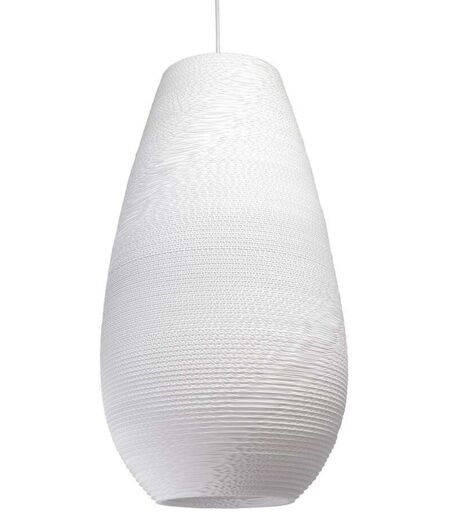 Die imposante graypants Drop Pendelleuchte wird komplett aus recyceltem Karton handgefertigt und ist daher ein absolutes Unikat. Sie besticht durch ihre einzigartige Lichtinszenierung und einer faszinierenden Oberflächenstruktur. Robust und dennoch elegant, die graypants Drop Pendelleuchte besteht aus einer extrem präzisen lasergeschnittenen Kartonkonstruktion, die von Hand mit ungiftigem Klebemittel Schicht für Schicht zusammengefügt und anschließend mit einem umweltfreundlichen, feuerhemmenden Mittel behandelt wird. Durch das innovative Design und unkonventionelle Material, bietet die charakteristische Scraplight Serie von graypants eine warme, intime und funktionale Beleuchtung für jede private und gewerbliche Räumlichkeit. Die zeitlos elegante graypants Drop Pendelleuchte strahlt teils direktes Licht nach unten und teils diffuses Licht durch die Löcher der Wellpappe. Als Highlight wi... ...